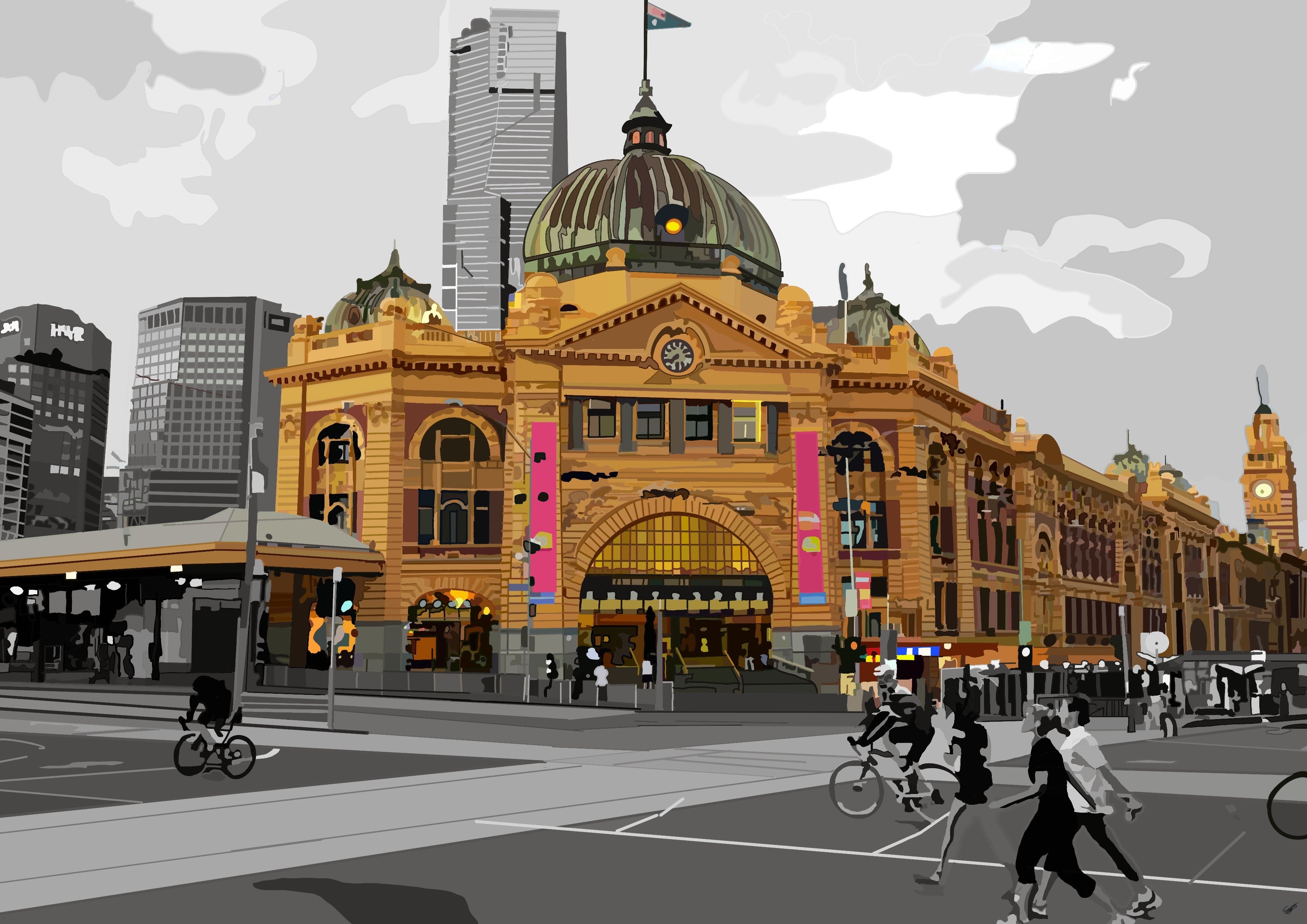 In this exhibition Stefan Farinaexplores his love of Melbourne and the iconic buildings that make this city special. Working between digital art and painting, Stefan has developed a unique style that flattens the landscape through his use of planes of colour allowing the subject matter to shine in vibrant colours.